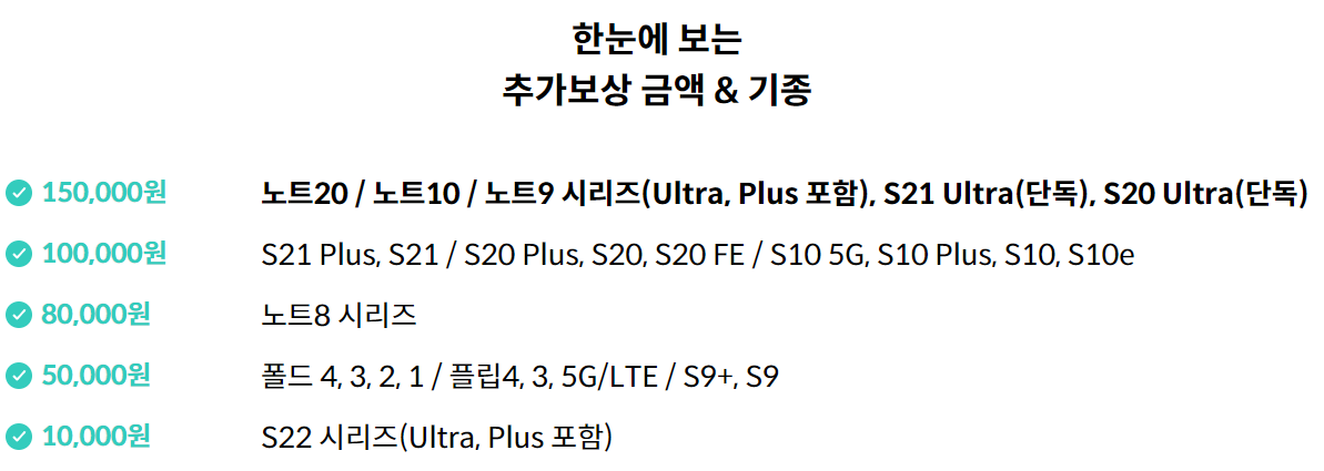 저번 갤럭시S22 때는 최대 추가 보상금이 15만 원, 작년 하반기 폴더블폰 출시 당시에는 최대 추가 보상금이 10만 원이었어서 점점 혜택이 줄어드는가 했는데 이번에 다시 최대 추가 보상금이 15만 원이라고 합니다. 아직 모델별 추가보상금액이 확정되는 시기는 2월 7일이지만 가장 최근 이벤트 때의 추가 보상금을 알려드리겠습니다.