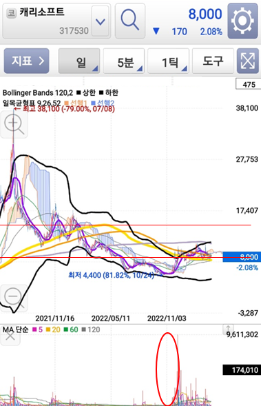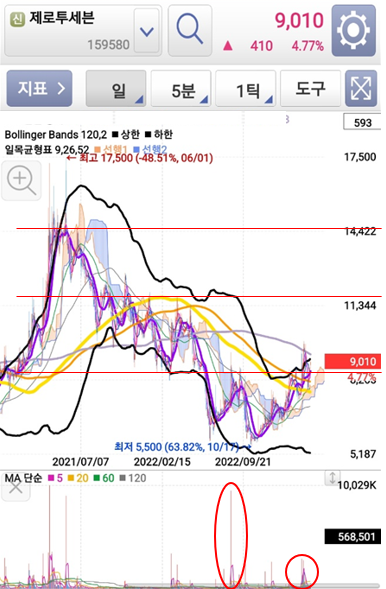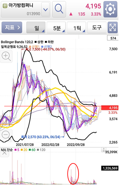 과거 거래정지 이력이 있어서 위험성을 수반하지만 그만큼 매물대가 적습니다. 그렇기 때문에 한 번에 치고 나가는 힘이 강력합니다.