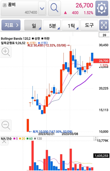 대장을 할 수 있는 이유는 신규 상장주이기 때문에 앞에 매물대가 비교적 없기 때문입니다. 하지만 최근에 많이 올랐기 때문에 급등락의 가능성이 큽니다.