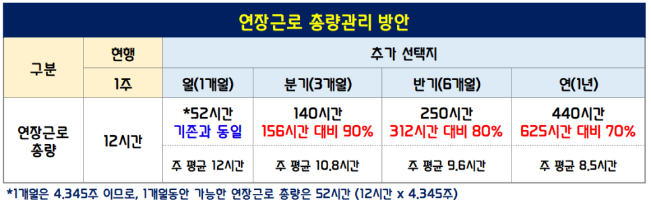 그리고 아무리 유연하더라도 야근 시간을 년 단위로 많이 당겨오는 것을 방지하기 위해서 연장근로 총량 관리 방안도 있습니다. 미래의 것을 많이 당겨올 점점 주 평균 연장 근로를 줄여야 된다는 내용입니다.