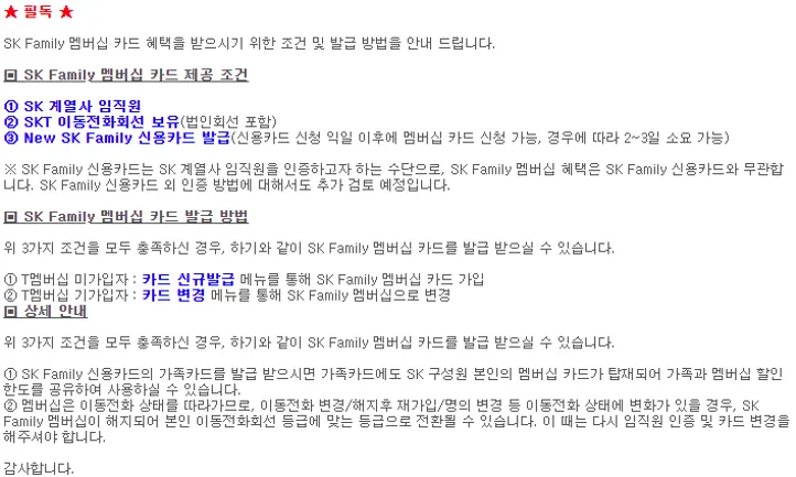 SK 구성원 분들 안녕하세요. 오늘은 SK패밀리카드로 T멤버십 VIP 등록 방법을 공유하려고 합니다.